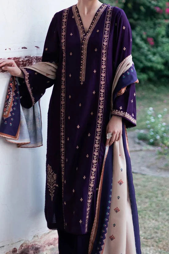 JAZMIN-3PC DHANAK EMBROIDERED SHIRT WITH COURTRAI PRINTED SHAWL & TROUSER-GM-4218