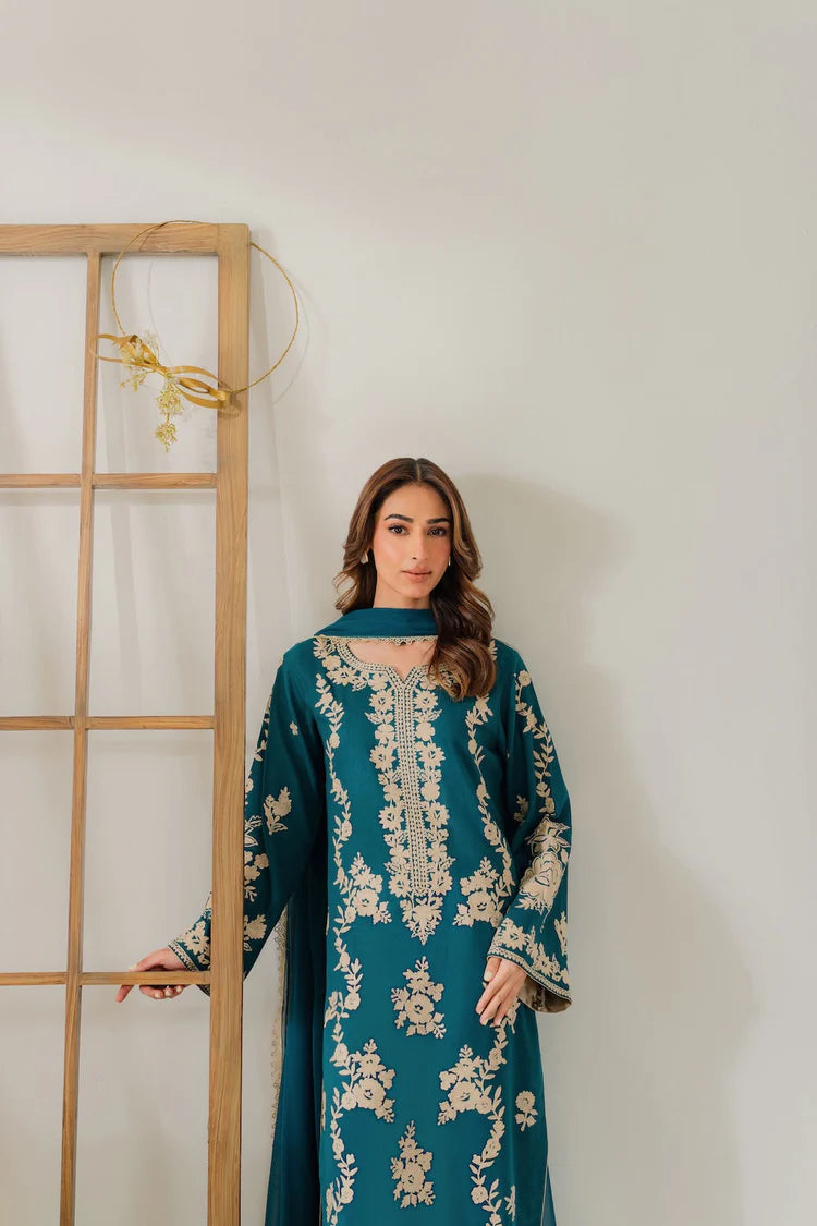 VINTAGE-3PC DHANAK EMBROIDERED SHIRT WITH BAMBER CHIFFON DUPATTA AND TROUSER-GM-4245