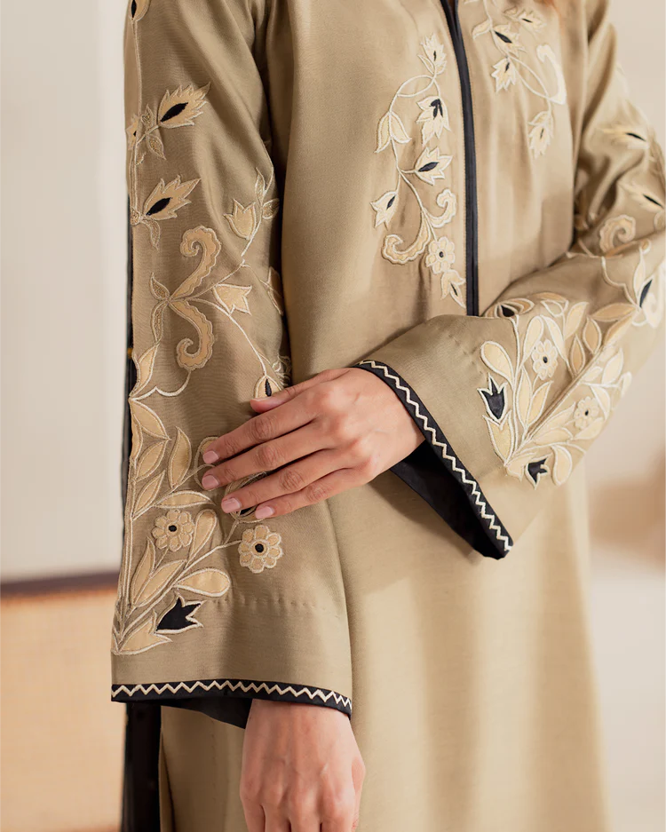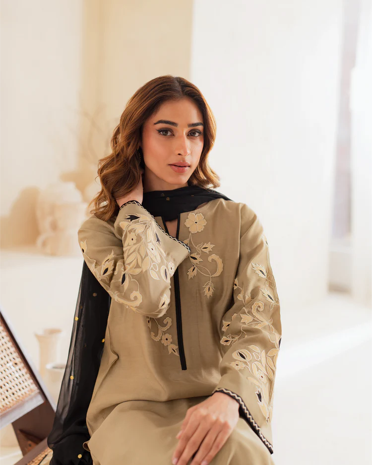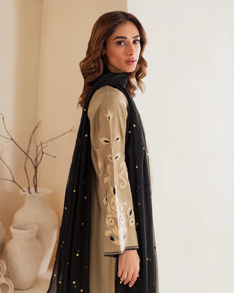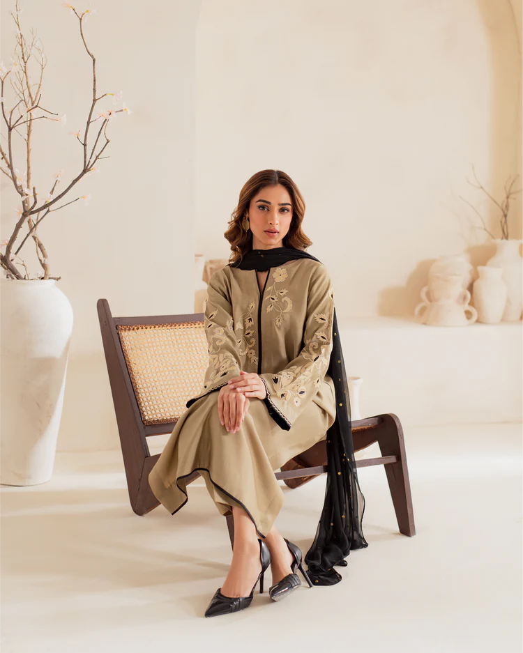 VINTAGE-3PC DHANAK EMBROIDERED SHIRT WITH KHADDI NET EMB DUPATTA AND TROUSER-GM-4292